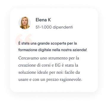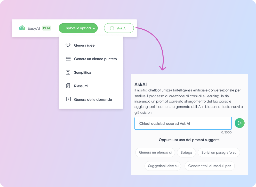 Sfrutta la potenza di EasyAI per sviluppare corsi di e-learning con la massima facilità ed efficacia, dalla semplificazione dei testi alla creazione di domande. Crea in tempi più brevi. Migliora la qualità. Stimola l’apprendimento.